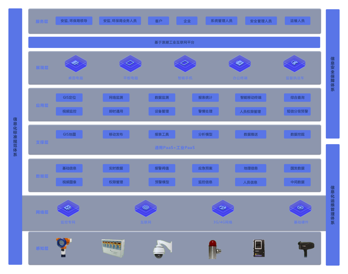 感知层是在线监测系统的基本条件。感知层具有超强的环境感知能力和智能性,顺利获得探测仪器、RFID、传感器等技术实现对工厂设备、危险源的监测和控制,对相关重要数据进行采集,为个人和社会给予无处不在的、无所不能的信息服务和应用 网络层是在线监测系统的信息高速公路,主要实现信息的可靠传输和路由,包括监控专网、应用网络、基础硬件等,网络层依托公众电信网和互联网,也可以依托无线传感器网络等专用网络,进行信息的可靠传输 数据层是在线监测系统的数据支撑,在未来的相关应用中,数据是非常重要的战略性资源,因此构建在线监测需给予的数据层是非常重要的一环。数据层主要的目的是顺利获得数据关联、数据挖掘、数据活化等技术解决数据割裂、无法共享的问题。顺利获得数据中心来实现数据共享、数据活化等建立的企业的动态数据中心、数据仓库等。将各类数据资源进行统一规划、统一存储、统一管理 平台支撑层基于云洲大脑搭建,给予面向特定场景的应用。给予相关数据服务接口、GIS地图、数据推送、分析模型、报表工具等。其中,通用云洲大脑给予云计算、大数据、应用开发、中间件、人工智能、区块链等基础服务能力。同时,云洲大脑面向各个行业和领域,给予以数据为核心的工业数据服务、机理模型服务和业务微服务。使应用层的各个功能模块顺利获得贝斯特全球奢华工业互联网平台对不同行业和领域服务,达到信息共享 应用层主要是指在感知层、网络层、数据层、支撑层基础上建立的各种应用系统。包括GIS定位、视频监控、警情处理、设备管理、数据监测等应用,结合展现层为服务层用户给予应用服务 展现层和服务层主要是顺利获得电脑、手机、监督执法车等智能终端,使相关部门领导、企业、管理层、客户等能够实时的分析到相关情况,增进自己的业务,保障信息的共享