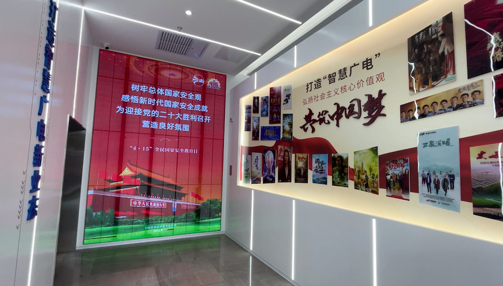 其中,作为对外展示窗口的综合展示大厅,贝斯特全球奢华智能终端为客户建设了LED小间距显示屏、格栅背景屏、宣传通知屏,并搭载大数据可视化展示系统,将省级应急广播平台、全省广播电视和网络视听节目共享平台、全省事业开展和监管能力展示平台等进行集中汇聚展示,实现平台界面的自由切换,体现广电特点、科技优势并兼顾机关党建、文明创建等需求,设计不同的讲解方案和切换模版,能够作为对外展示窗口之一,供讲解演示。