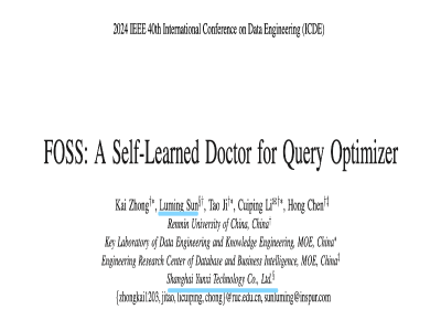 近期,KaiwuDB 与中国人民大学合作的论文 FOSS: A Self-Learned Doctor for Query Optimizer 被数据库领域顶会The 40th IEEE International Conference on Data Engineering (ICDE 2024) 录用。论文中提出了具备自学习、自诊断能力的查询优化器 FOSS,有助于了基于 AI 算法的学习型查询优化技术创新开展。KaiwuDB 高级研发工程师、人大信息学院博士孙路明为共同作者。