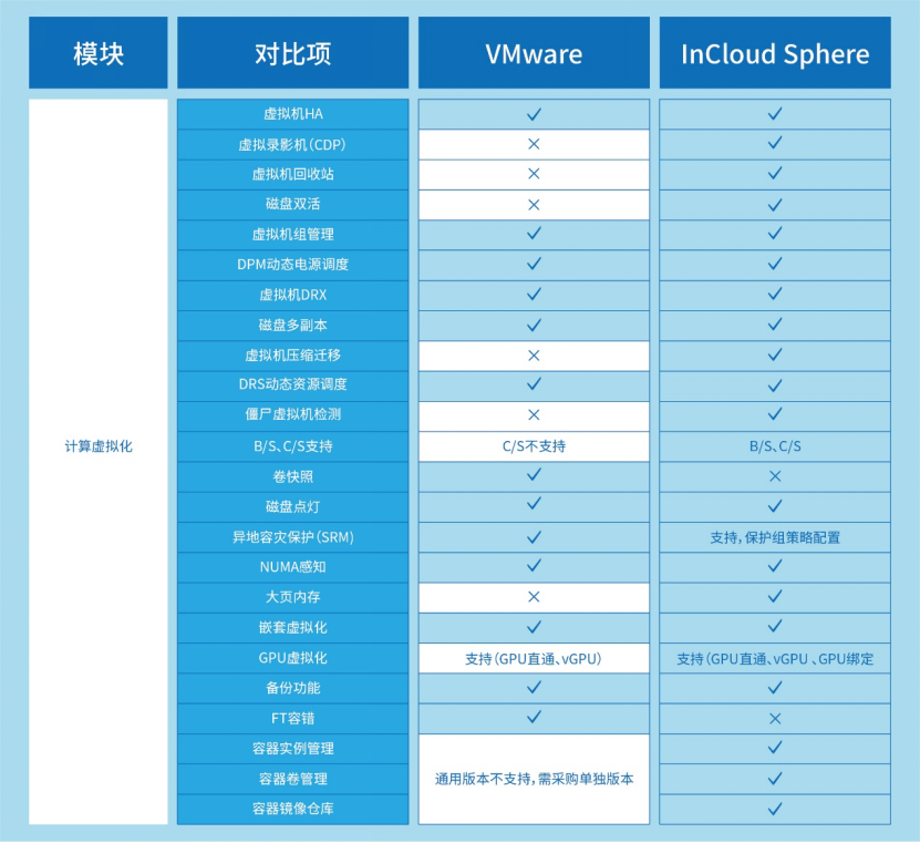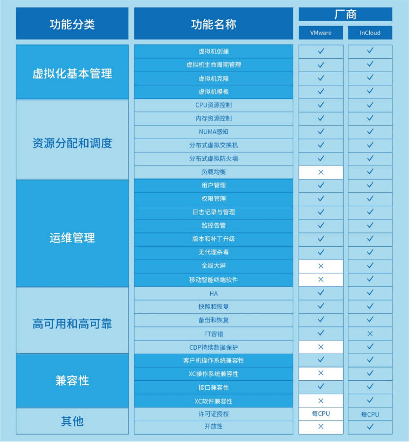 在VMware替代过程中,功能特性的全面性与匹配度往往是决策的核心考量。从虚拟化层的资源调度到超融合架构的存储效率,再到云管理平台的生态兼容,每一个组件的技术细节都直接影响迁移后的业务陆续在性与架构扩展性。