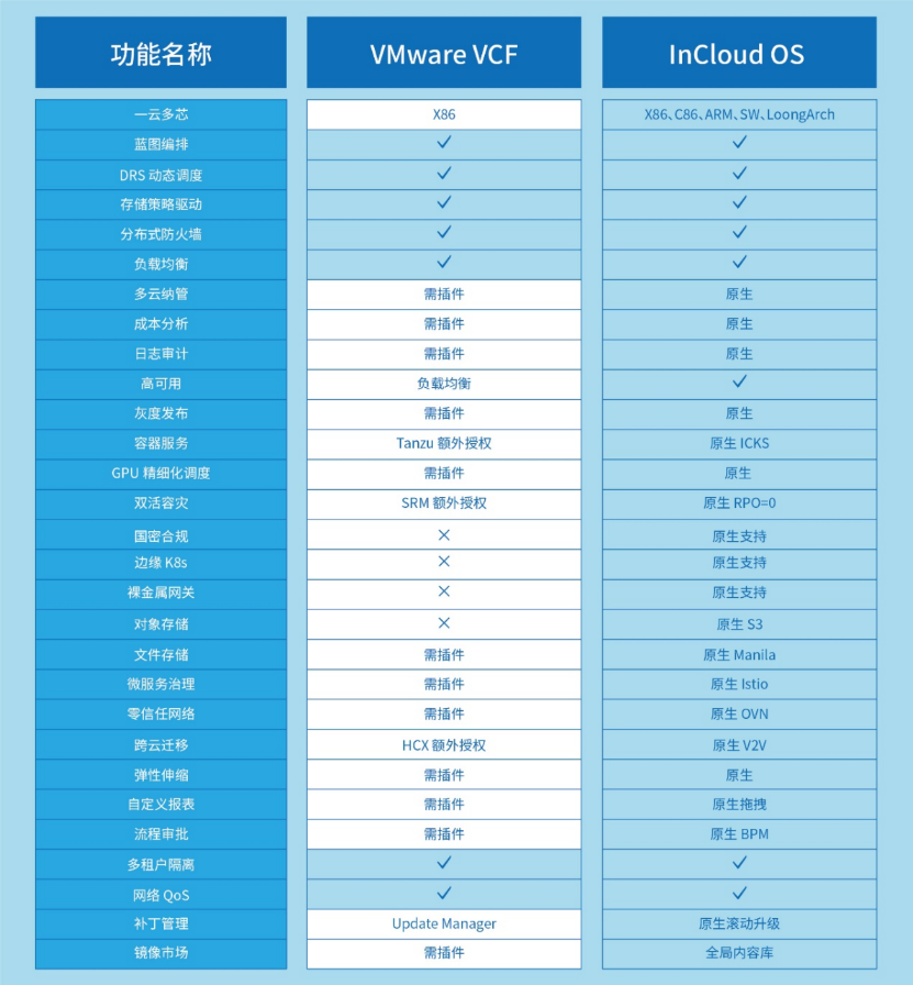 InCloudOS云管理平台功能对标VCF,更以“一云多芯”与原生集成能力,突破VMware架构限制,支撑IT基础设施的持续演进。